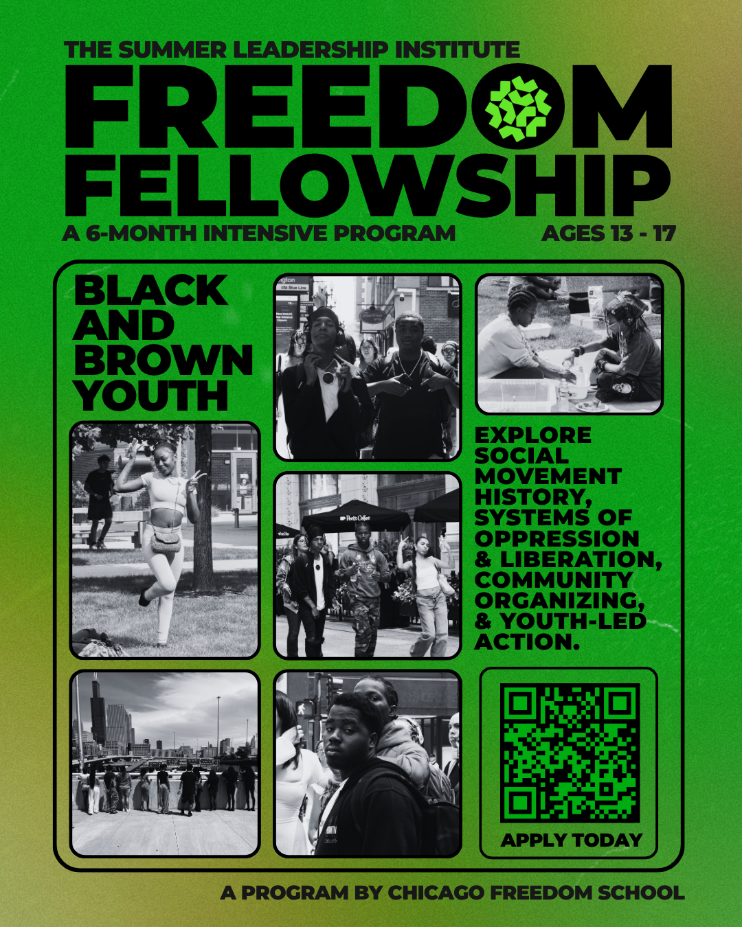 The FREEDOM FELLOWSHIP is a 6-month social justice leadership program that brings Black and Brown Chicago area youth ages 14-17 together to envision and share skills to build the world we want to live in. The FELLOWSHIP explores social movement history, systems of oppression and liberation, community organizing, and youth-led action.